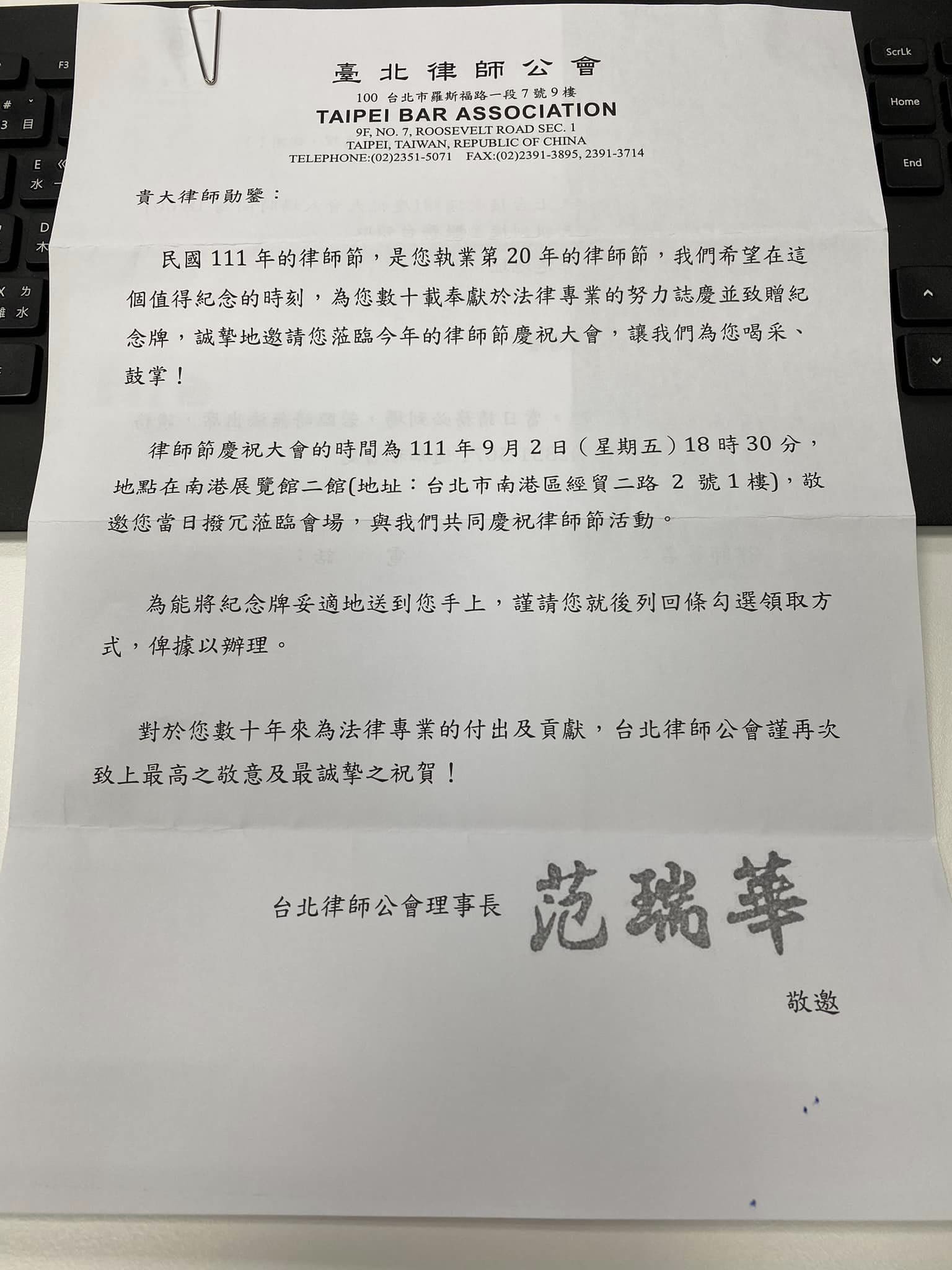 本所執行合夥律師謝昆峯受邀參加台北律師公會舉辦的「律師節慶祝大會」,並獲頒「執業20年資深律師獎」